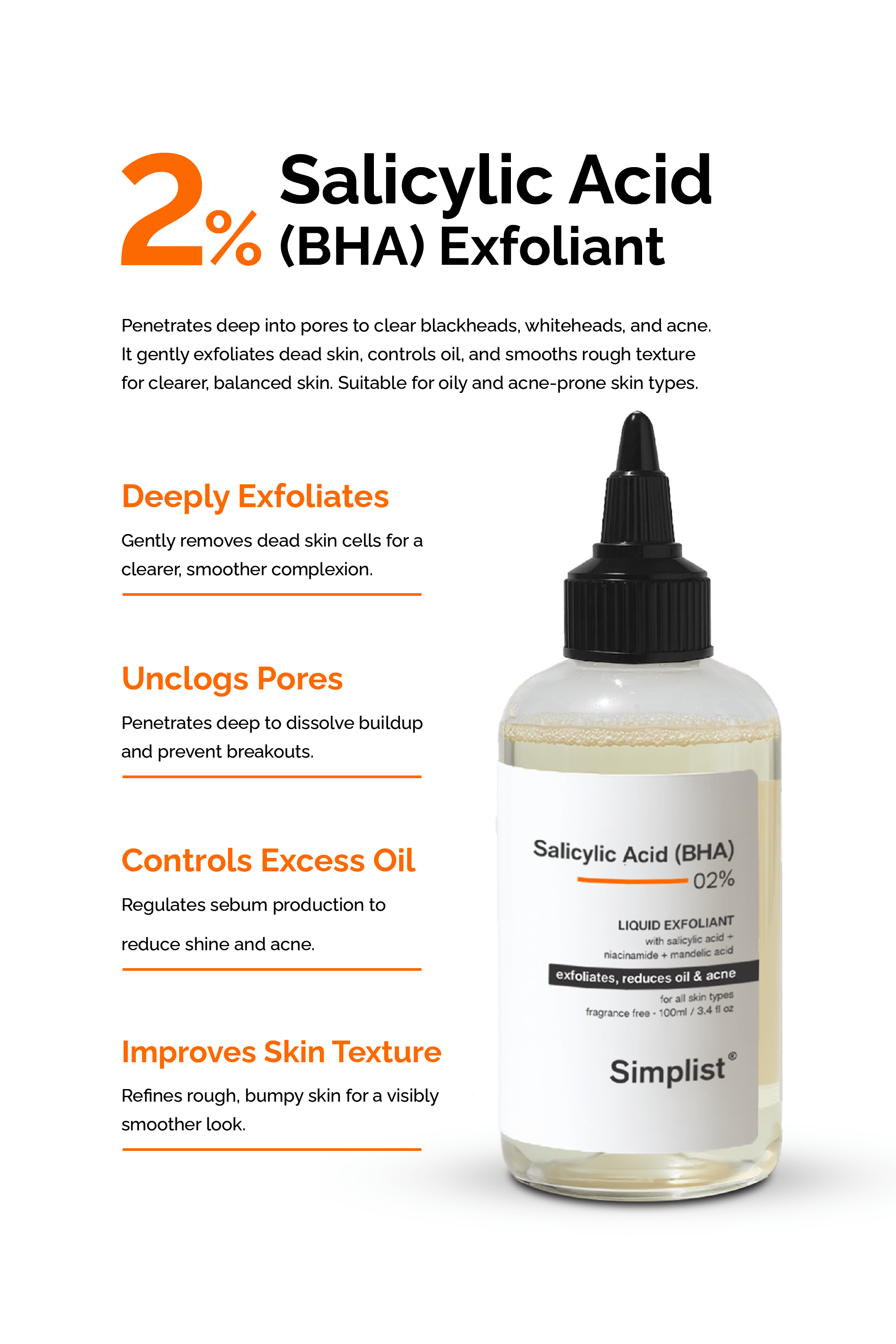 Salicylic Acid: A powerful BHA that deeply penetrates pores to dissolve oil, clear blackheads, and prevent future breakouts.