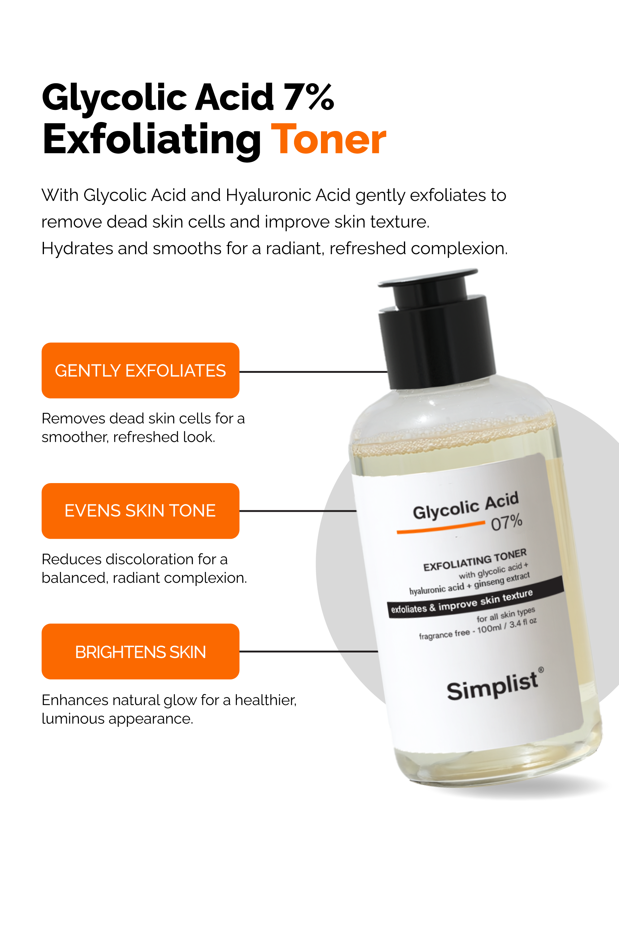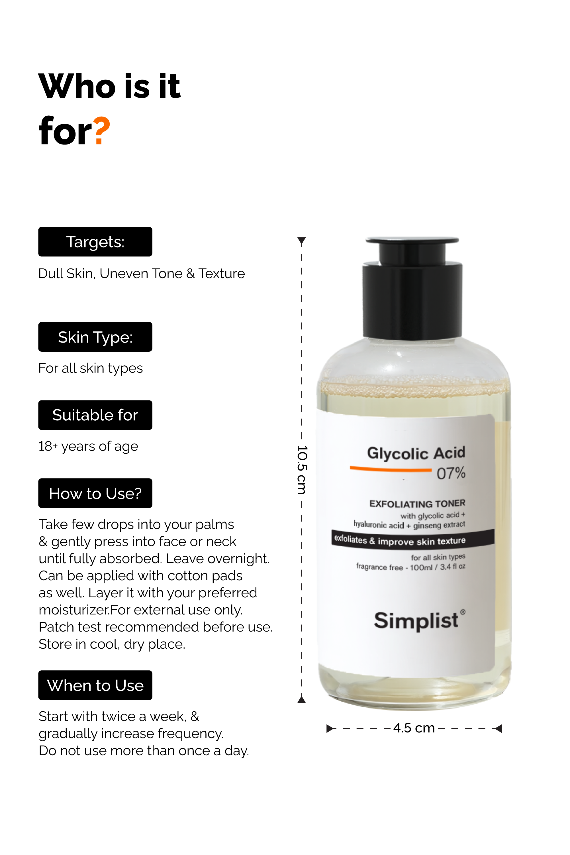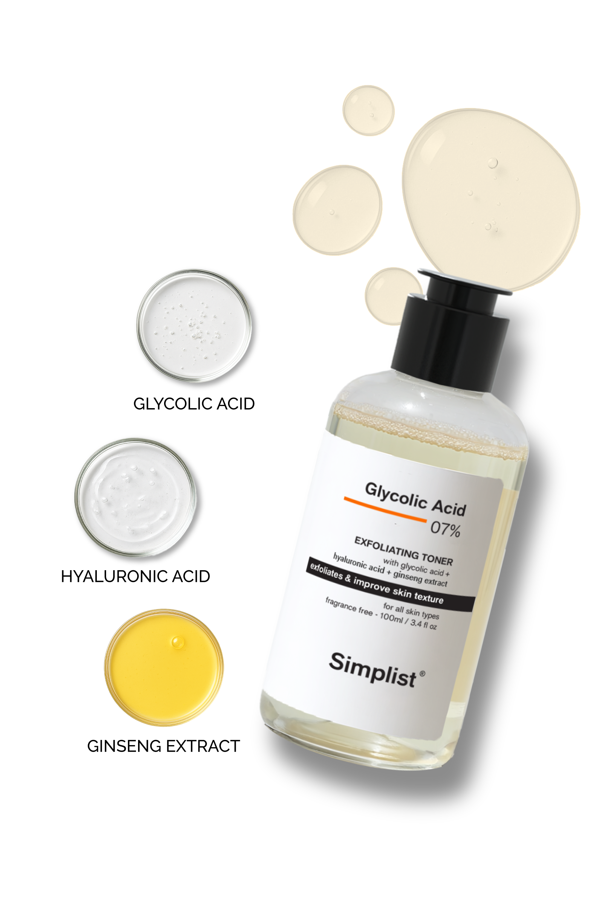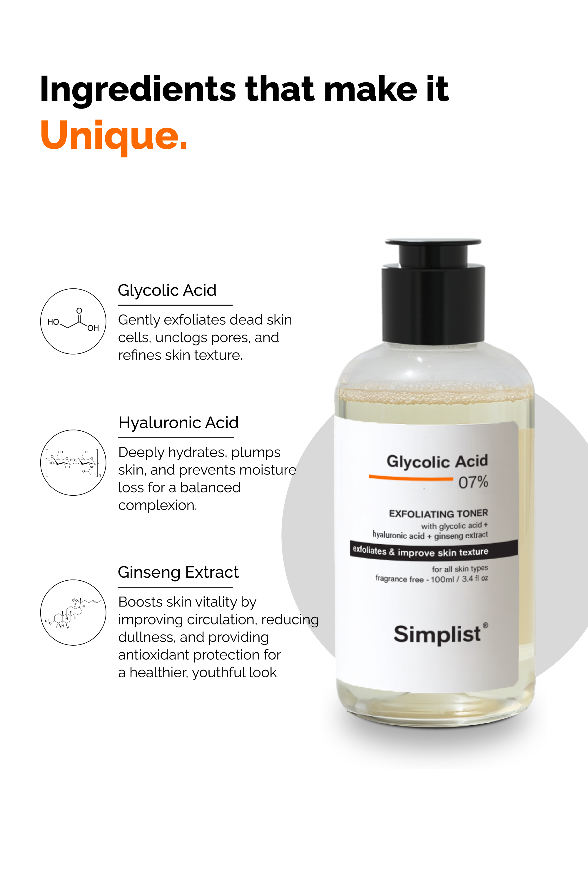 7% Glycolic Acid Exfoliating Toner with Glycolic Acid, Hyaluronic Acid, and Ginseng Extract gently removes dead skin cells, unclogs pores, and refines skin texture. It helps reduce keratosis pilaris (strawberry legs), body acne, and rough patches while hydrating and soothing the skin. With regular use, it smooths, balances, and evens out tone, leaving the skin radiant, refreshed, and healthier-looking from head to toe.