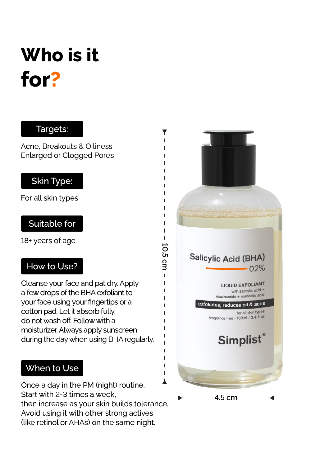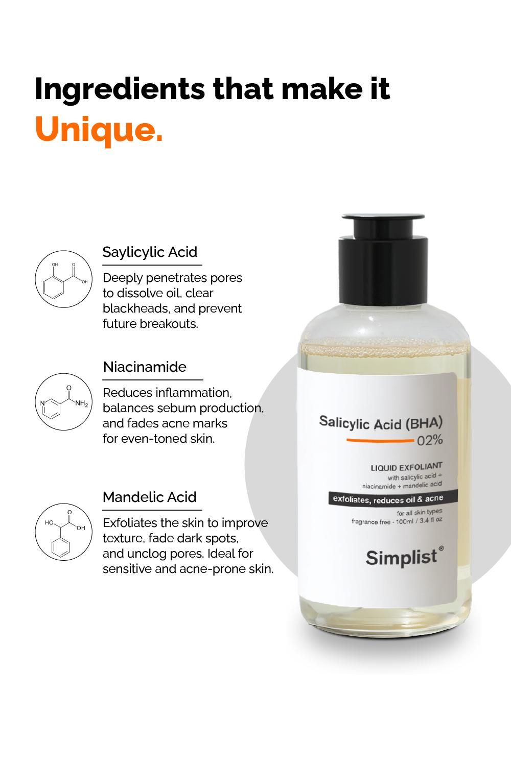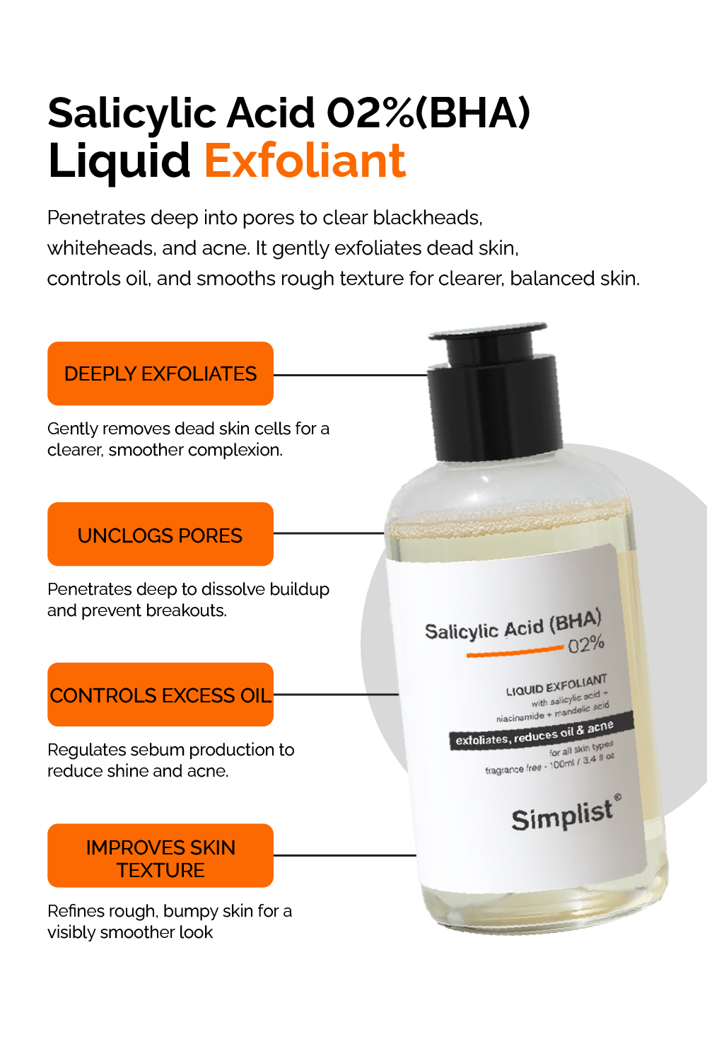 Salicylic Acid: A powerful BHA that deeply penetrates pores to dissolve oil, clear blackheads, and prevent future breakouts.